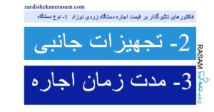 • در مورد تاثیر غیرمستقیم، مدت زمان اجاره نیز می‌تواند به عنوان یکی از فاکتورهای تاثیرگذار بر قیمت اجاره دستگاه باشد.